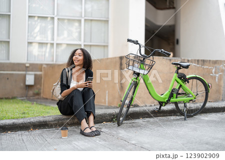Sustainable Transportation and Urban Lifestyle. A young woman enjoying a moment while using her phone next to a green bicycle.