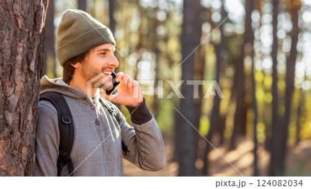 Happy young man backpacker talking on smartphone while hiking at countryside, looking at copy space