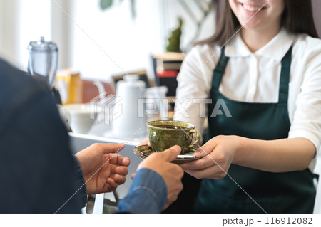 カウンターでコーヒーを手渡しする店員
