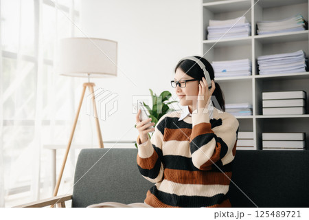 Smiling girl relaxing at home, she is playing music using smartphone tablet, and wearing white headphones. on sofa