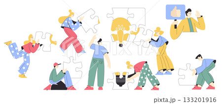 Jigsaw Puzzle with Man and Woman Connecting Element Together Vector Set