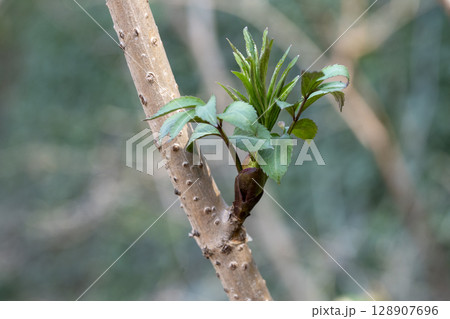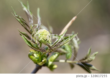 春に芽吹き始めた精霊の宿るニワトコの若葉と蕾