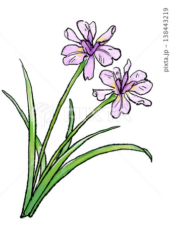 咲き誇るヒメシャガの花の手描きの線画と水彩イラスト