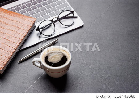 Office desk table with laptop, cup of coffee and supplies