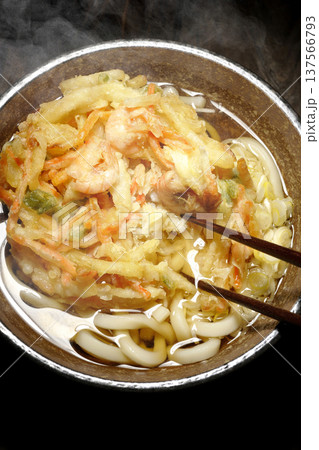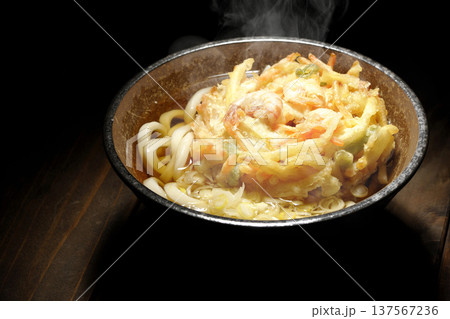 海老と野菜の熱々かき揚げうどんを黒背景で撮影