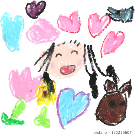 大きなハートとにっこり笑顔の女の子 クレヨン画