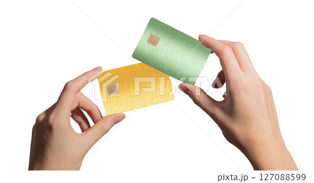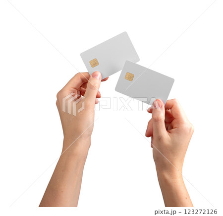 Modern bank service. Hand holding two plastic cards with chip for credit, debit, loan, cashback,