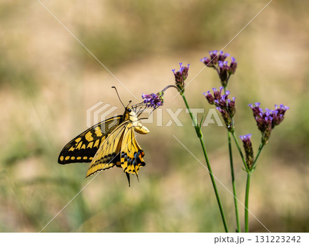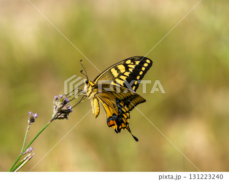 女郎花の花蜜を求めて飛ぶアゲハチョウ