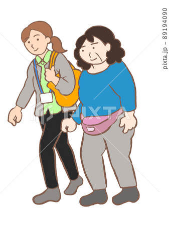 精神科入院中の統合失調症の女性と外出する精神保健福祉士のイラスト