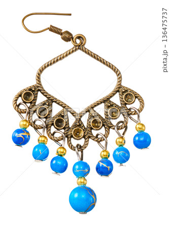 白背景に切り抜かれた青いビーズとアンティーク調真鍮のエスニックなピアス