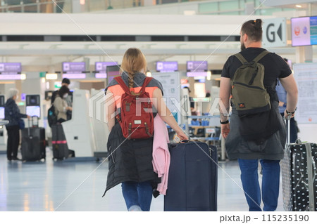 搭乗ゲートに向かう乗務員と乗客 スーツケースを引く空港利用者