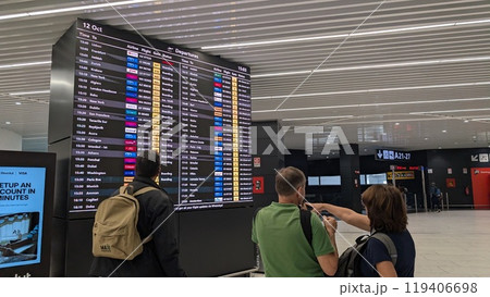 ターミナルの案内表示を確認する乗客 チェックインを案内する空港職員