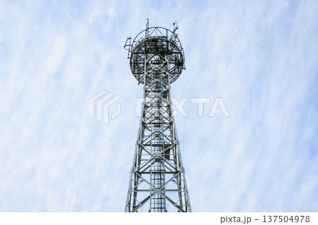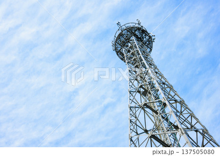 青空にそびえ立つ赤と白の通信鉄塔・電波塔