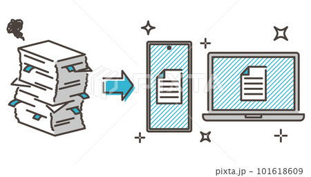 事務書類の山をスマホとPCでデータ化【ベクターイラスト素材】
