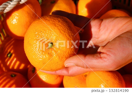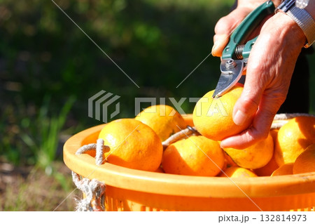 デコポン畑で摘果をしているシニア女性 切る直前