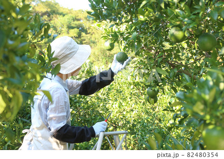 デコポン畑で摘果をしているシニア女性 右向き ニーアップ