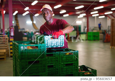 Positive Afro workman stacking boxes with harvested peaches on fruits sorting department