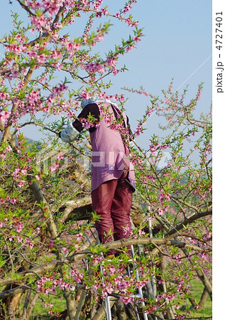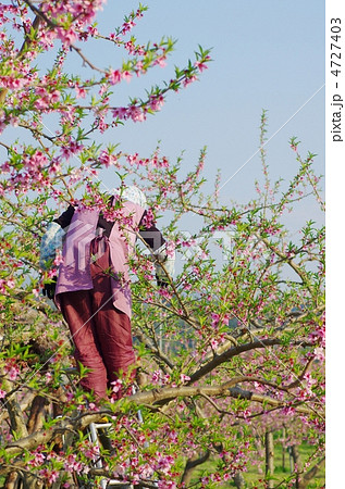 桃の花の摘花作業 桃の花の摘花する農婦の様子