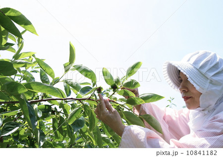 桃の摘花をする農婦