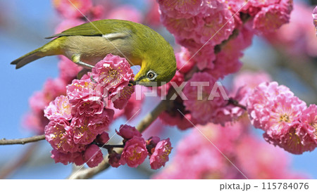 満開の紅梅でお食事中のメジロさん( 春イメージ )( ほのぼのイメージ )