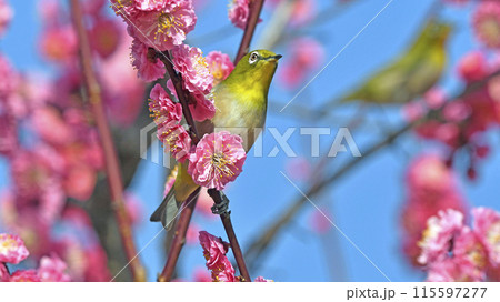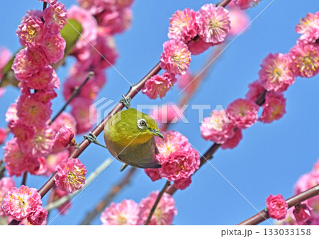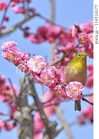 満開の紅梅にメジロ( 小春日和イメージ )( ほのぼのイメージ )