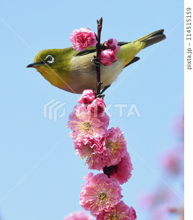 満開の紅梅を独り占めにするメジロさん ( 春イメージ )( 春うららかイメージ )