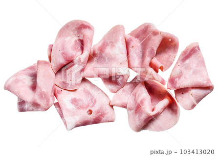 Cutted pork Ham Sausage. Traditional German boiled ham. Isolated on white background.