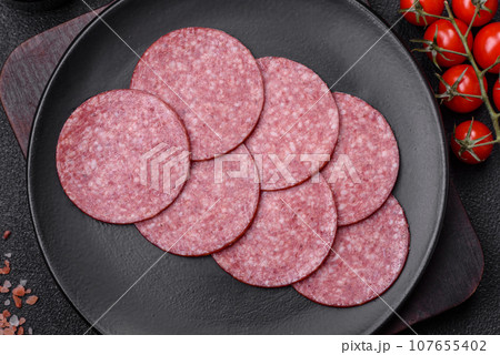 slices of traditional sausage salami fuet or dry sausage