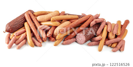 Various dry-cured and smoked sausages isolated on white.
