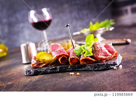 Delicious smoked Armenian basturma with spices and herbs