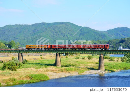 大洲城を背に肱川を渡る観光列車「伊予灘ものがたり」