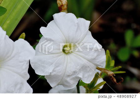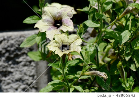 三鷹中原に咲く緑色と紫複色のペチュニア