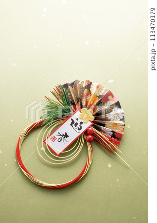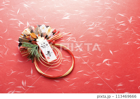 松竹梅と水引が飾られた華やかな正月飾りの黄色背景スタイリング写真