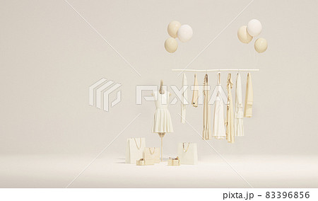 Clothes on a hanger surrounding by shopping bag and gift on pastel background. Collection of clothes hanging on a rack in neutral beige colors. 3d rendering, store and sale concept
