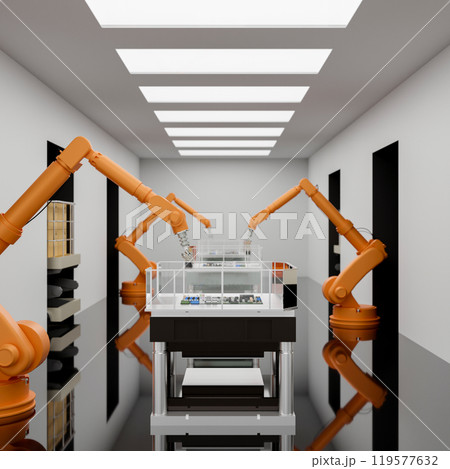 Robotic arms are assembling high-end technology circuit boards in a modern factory.