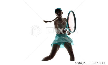 Female tennis player dynamic backhand motion isolated on white.