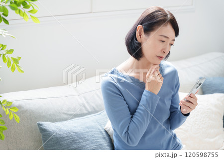 スマホを使うミドル女性(悲しい・ショック・落ち込む)