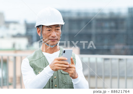 スマートフォンを持つ作業員の男性のセット(見る/タッチ)