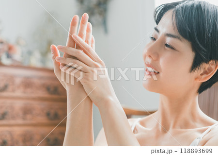アルコール除菌する女性 手指消毒スプレー コピースペース 16:9