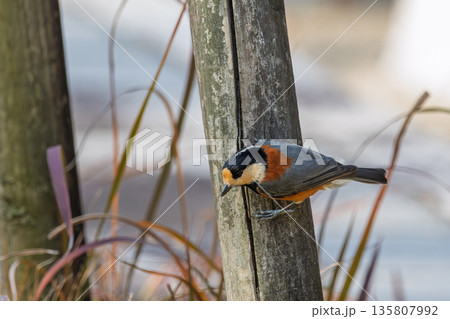竹の支柱にとまり辺りを見渡す可愛いヤマガラ