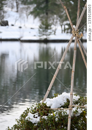 雪に包まれた竹支柱と池の静寂