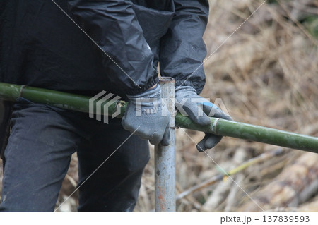 支柱に竹を括り付ける男性
