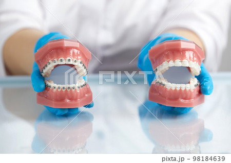 Orthodontist showing model of human jaw with wire braces and aligners explaining the difference