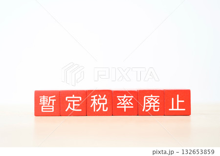 ガソリン暫定税率廃止を示す6個の赤ブロック。白背景にコピースペース。