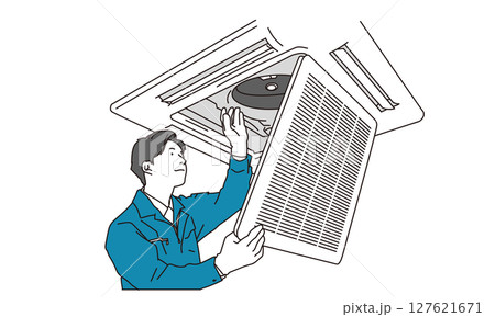 業務用エアコンの空調設備を確認する作業員男性のイラスト