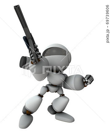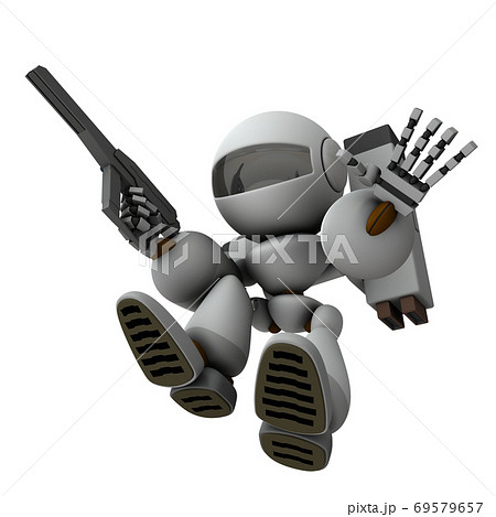 降下侵攻する武装ロボット兵。3Dレンダリング。白バック。