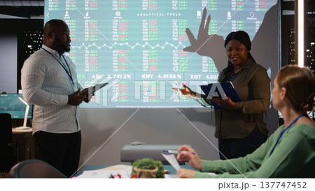 African american associates presenting their pitch to shareholders in a late night meeting, discussing about the financial situation and working for success. Evaluate supply and demand. Camera A.