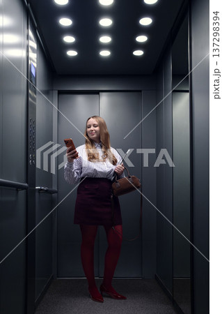 Businesswoman checking smartphone while standing alone in office elevator.