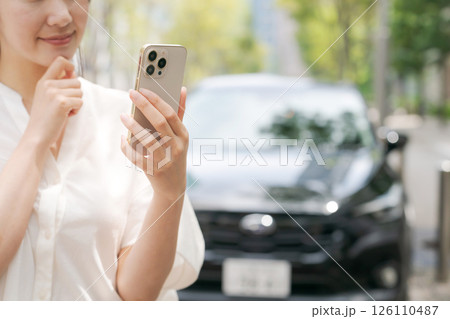 車の前でスマホを操作する若い女性