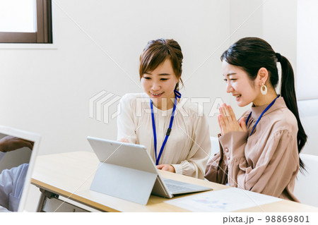 会社のオフィス・会議室で若いスタッフに教えるビジネスウーマン(教育・研修・アジア人・日本人・中国人)